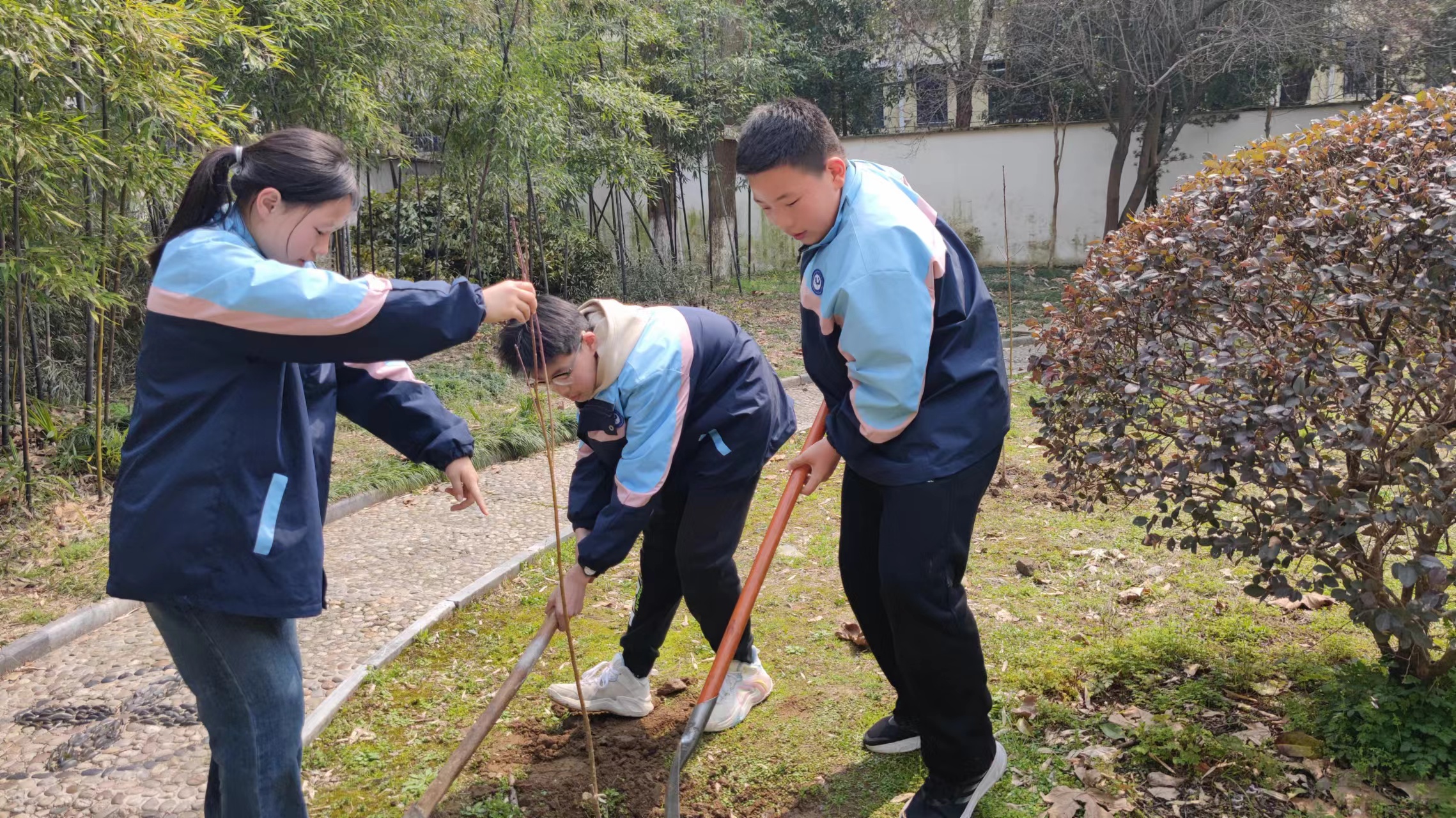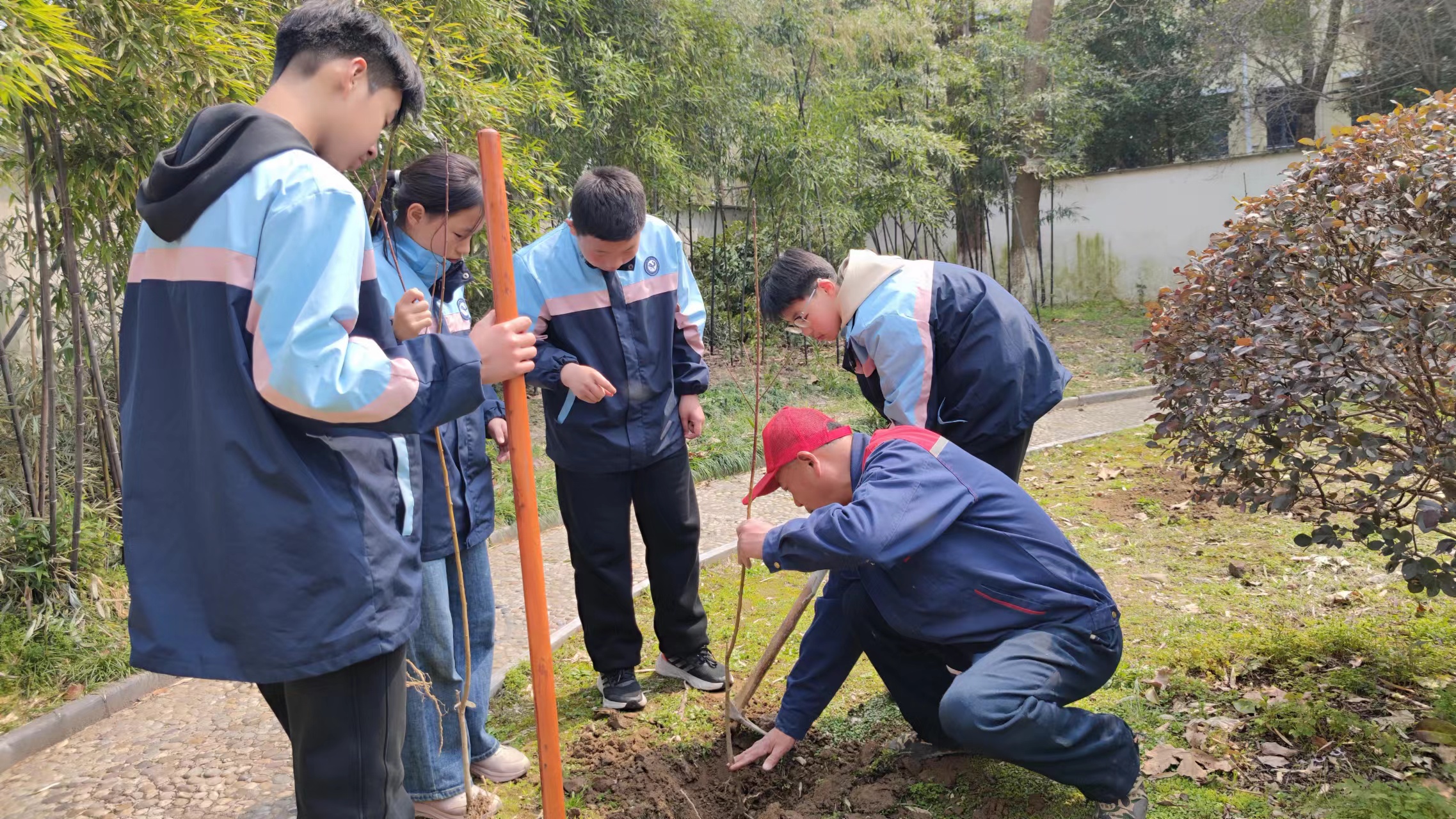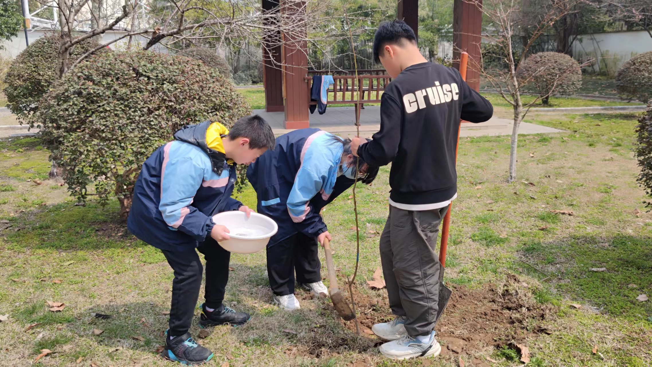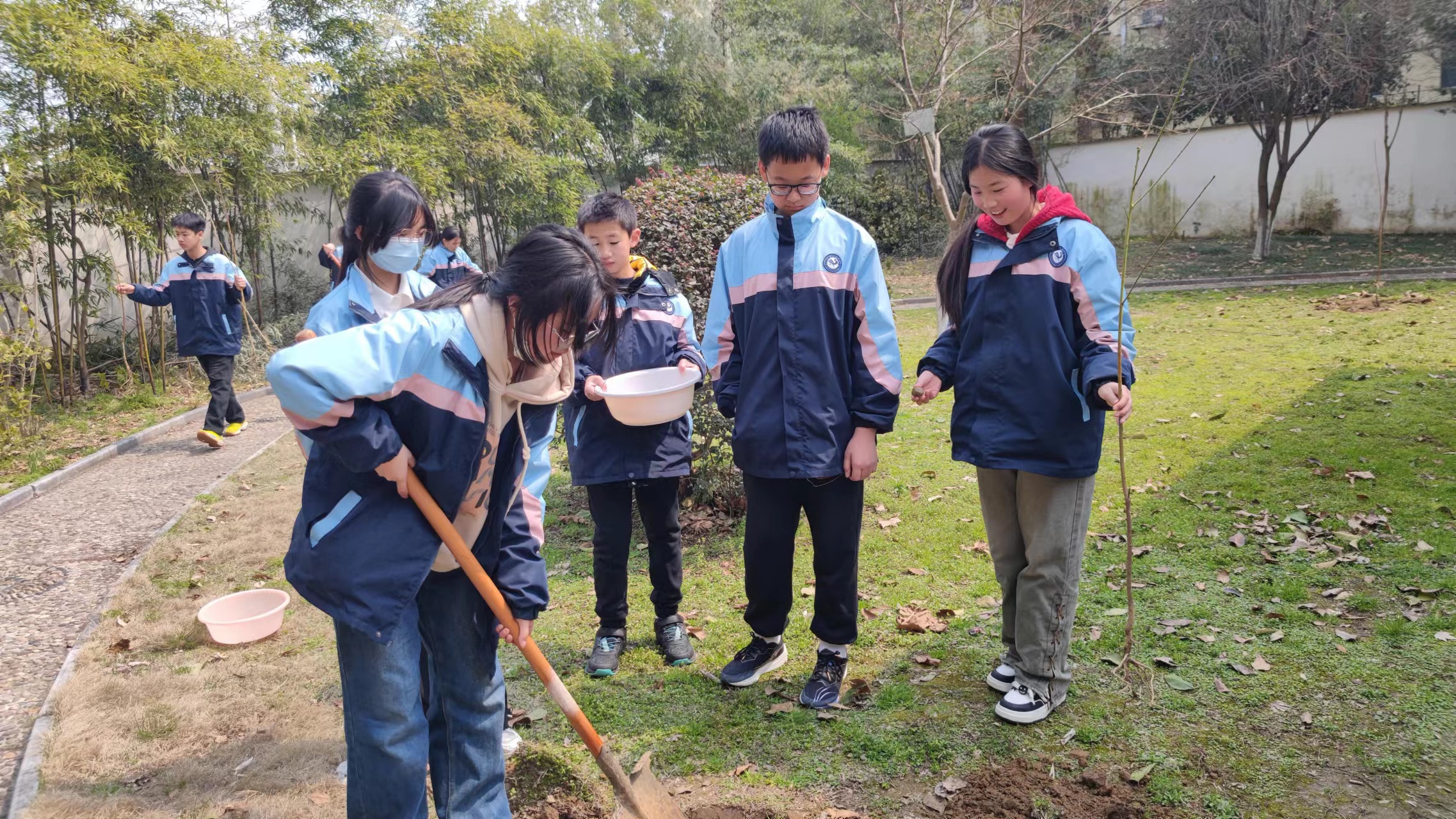 植一株绿色,溢一抹春光。同学们分成小组,手持铁锹、水盆等工具在老师和苗圃师傅的带领下,一起铲土、放苗、浇水,热火朝天的享受着植树的乐趣。