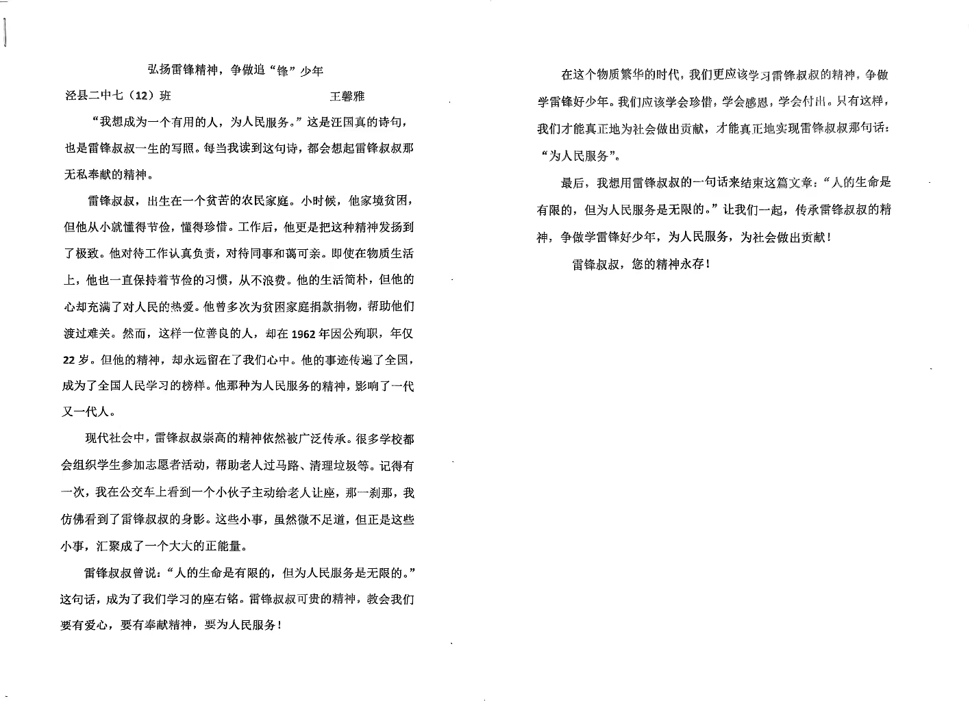 一笔一画书写雷锋精神,亲力亲为诠释大爱无疆——初中寄宿班“学雷锋”征文