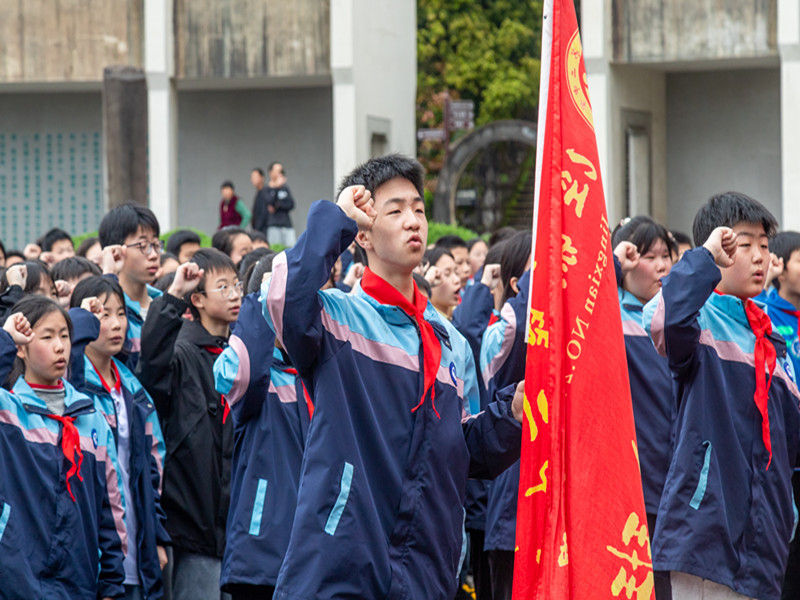 敬献花圈后,校少先大队辅导员曹阳带领全体七年级少先队员面向革命烈士纪念碑和少先队队旗,重温入队宣誓。