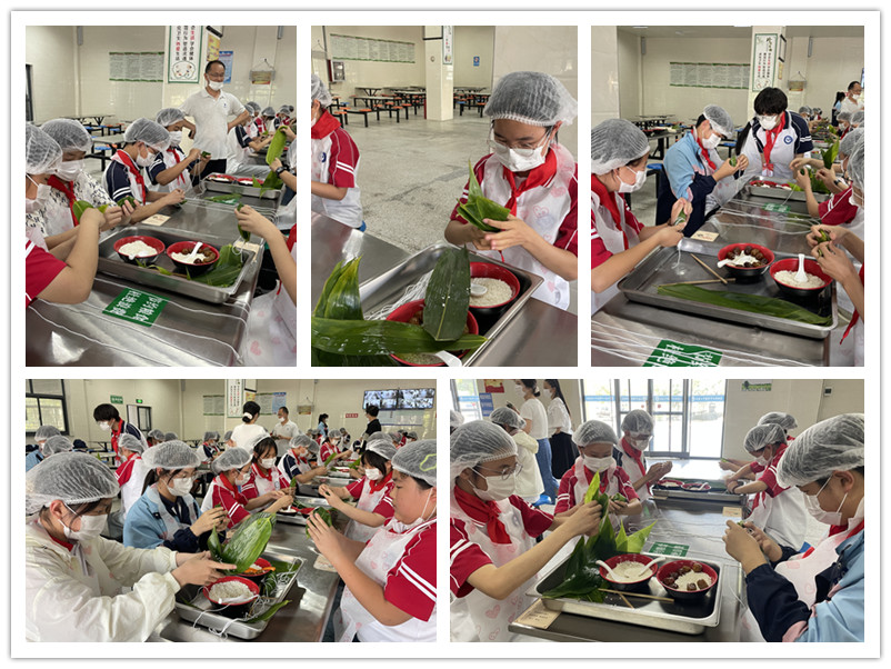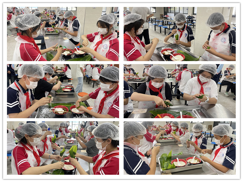 白胖子,绿毯子,腰里扎着细绳子,本次劳动技能大赛主要比拼队员们的包粽子技能。校后勤服务中心、校团委工作人员提前准备好食材及餐饮卫生用具,少先队员们精心准备,积极投入到包粽子活动中。卷叶、放馅、系绳,一收一拢一缠绕,一个个有棱有角有面的端午粽就成型了。部分技能娴熟的队员系绳时,用牙咬住线的一头,一只手紧紧拉住粽子,另一只手剪去线头,最后扎上漂亮的活结,动作潇洒流畅。比赛过程中,工作人员及青年志愿者们协助维持赛场秩序并进行成绩统计汇总。
