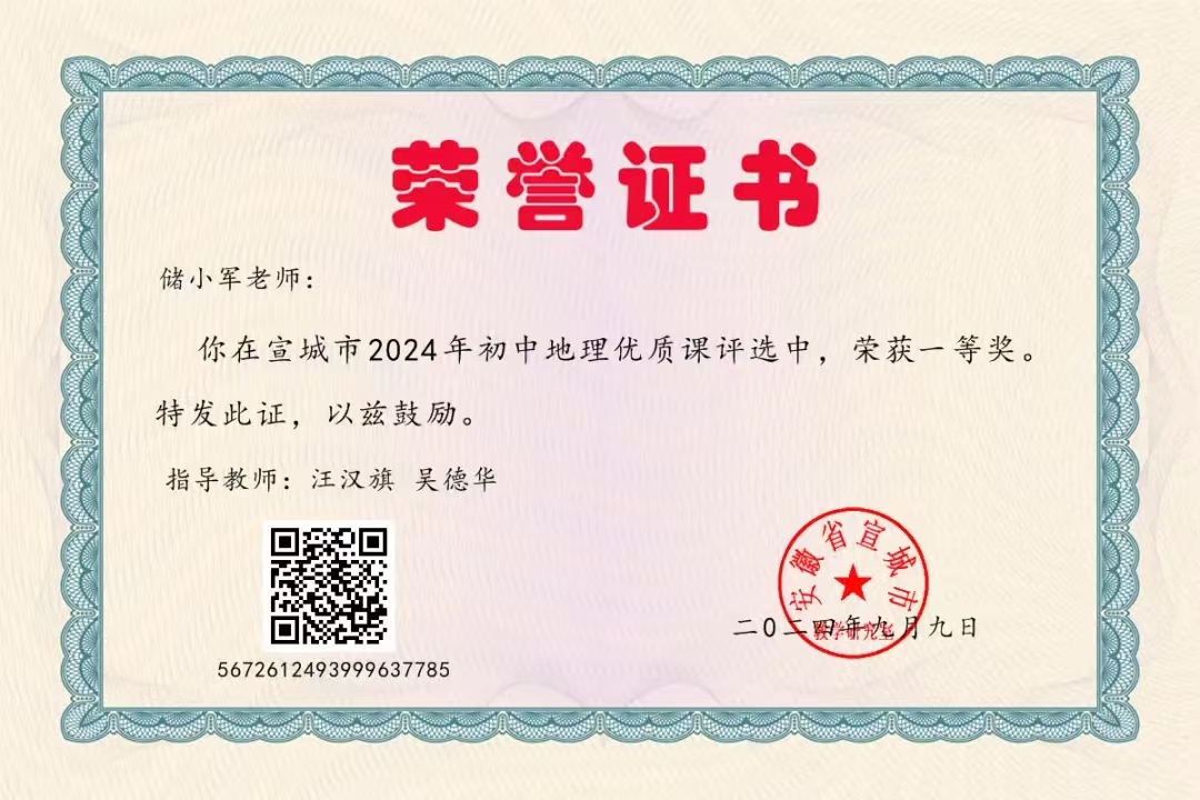 热烈祝贺我校储小军老师获宣城市初中地理优质课评选一等奖(指导教师:汪汉旗、吴德华)!