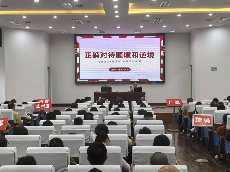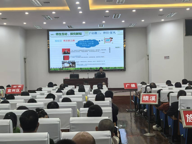 为进一步推进新课程理念落实,帮助广大一线教师准确把握新教材的编写理念和指导思想,并将新的教育理念和方法应用到教学实践中,让学生可以更好地适应新时代社会发展的需要。10月16日,宣城市教育局组织全市初中起始年级道法教师在我校开展初中阶段新课程新教材市级培训与研修,来自全市一线教师和教研员共二百一十多位老师参加此次活动,活动在我校艺术楼二楼报告厅举行,宣城市教研室程云霞老师主持本次活动。