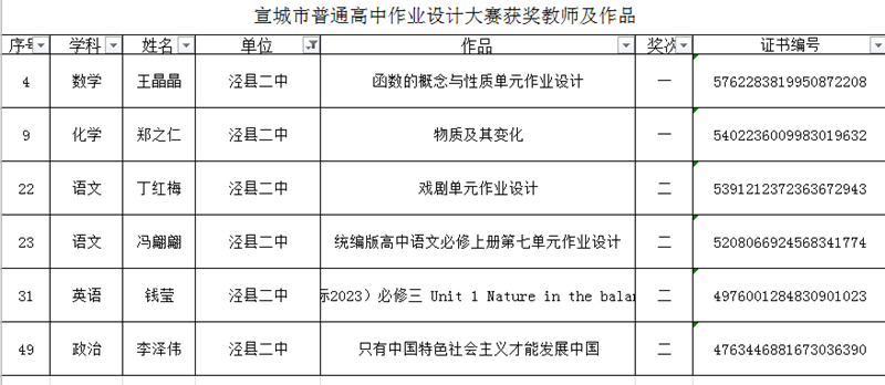 2024年宣城市普通高中作业设计大赛结果揭晓,我校喜获佳绩,一等奖两人,二等奖四人,向获奖的老师表示热烈祝贺!