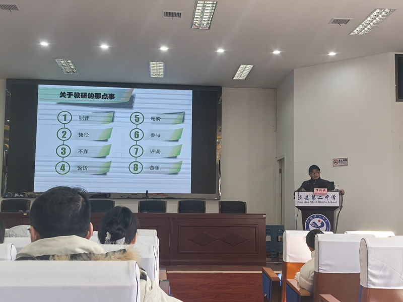 最后,教科室主任汪汉旗作了题为《关于教研的那点事》的专题报告。他从职称、捷径、不弃、说话、翅膀、参与、评课、苦乐八个方面并结合自己的经历分析了教研活动对青年教师成长的促进作用。汪主任分析了在评职称的过程中青年教师应该注意的问题,以及提醒教师要紧跟时代变化和学生发展变化,让教研活动更好地服务于教学活动。他强调青年教师也要静下心来开展教研,更要体会开展教研活动过程中的苦与乐,从而促进自身专业成长。