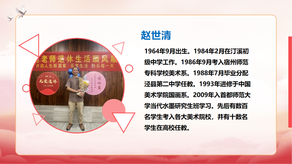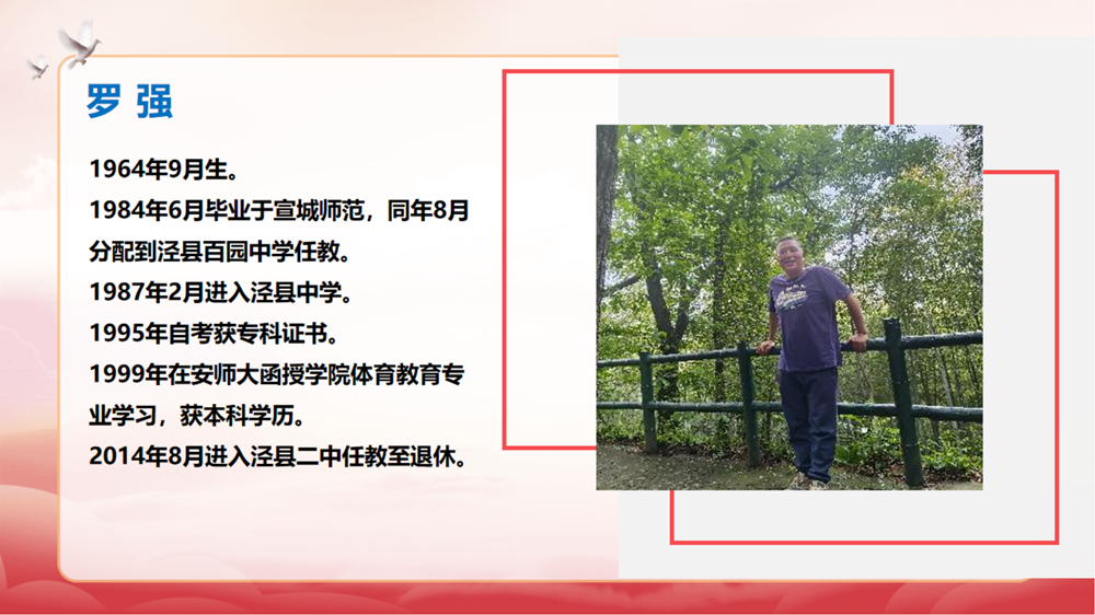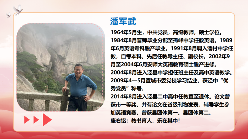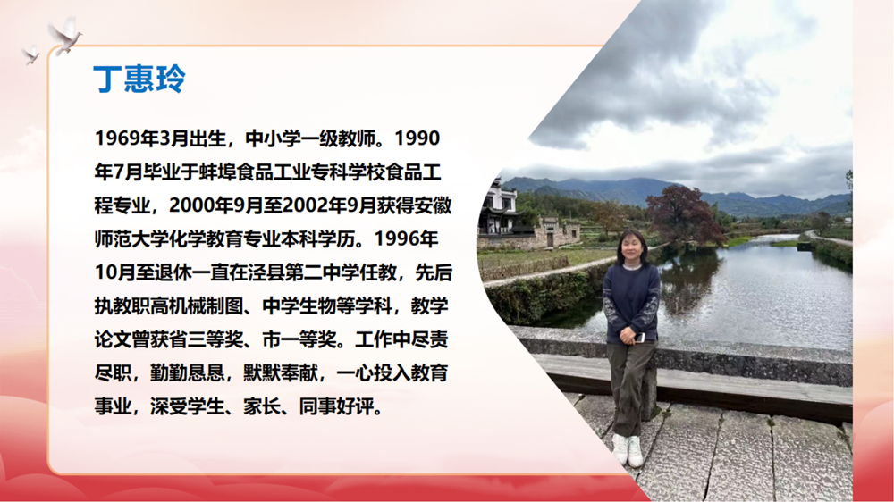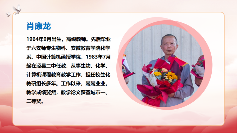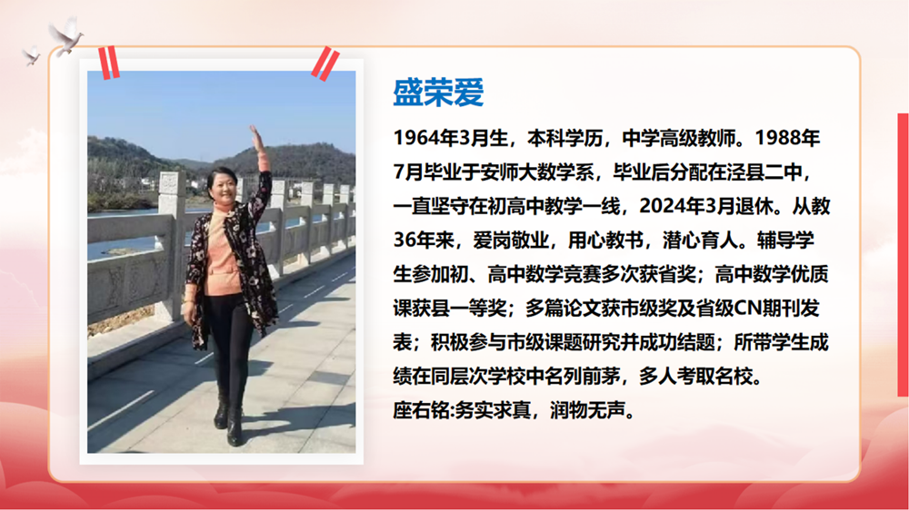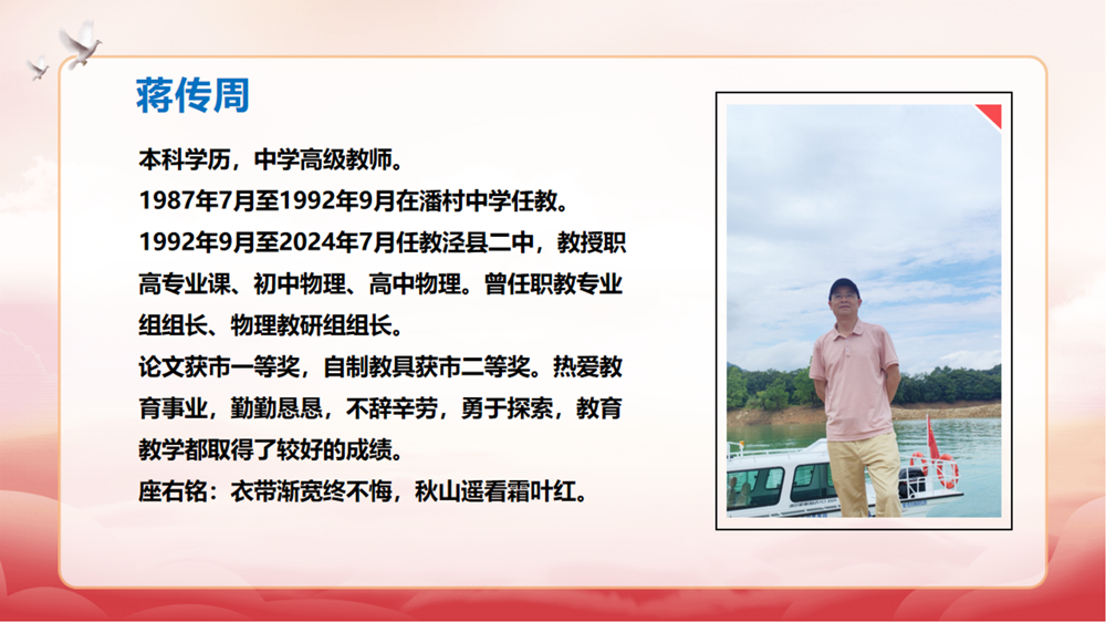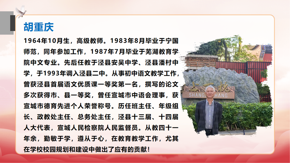 王松华介绍退休教师从教经历。大屏幕播放着九位老教师的教学事迹,大家回顾着每位退休教师平凡却不平庸的工作成绩和贡献,感谢他们几十年如一日地奋战在管理育人、服务育人的第一线,为学校的发展做出重要贡献。看着面前的大屏幕,荣休教师们伴随着二中发展的教学印记浮现眼前,让老师们感慨岁月的变迁。