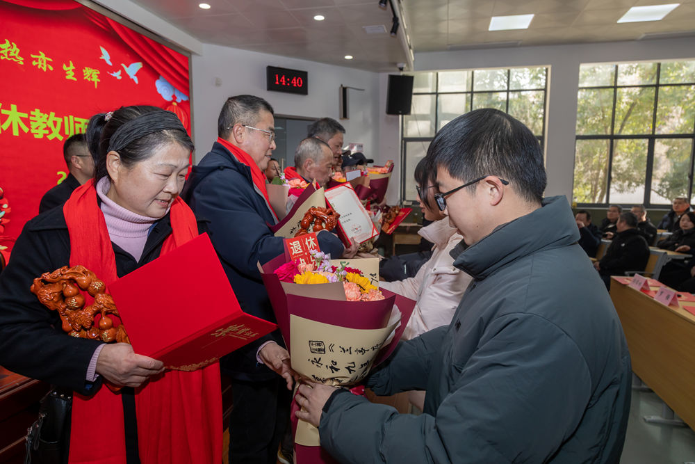 校领导为荣休教师颁发荣誉证书、红围巾和纪念品。青年教师献上鲜花表达深深敬意和美好祝愿,也象征着薪火相传。