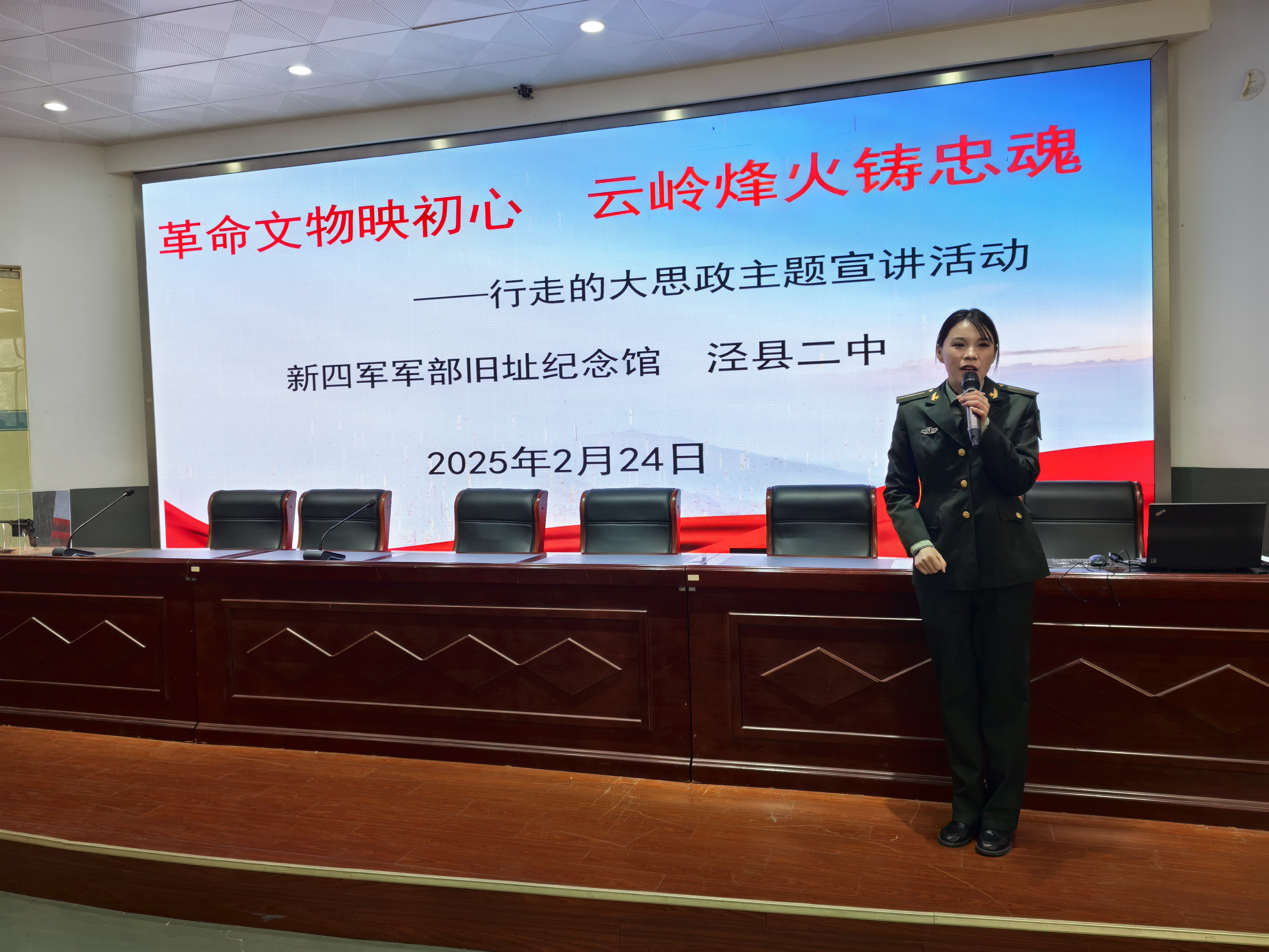 2月24日下午,泾县二中阶梯教室内气氛热烈,一场别开生面的“革命文物映初心 云岭烽火铸忠魂”——行走的大思政课主题宣讲活动在这里举行。此次活动由泾县二中精心策划,特别邀请了新四军军部旧址纪念馆的汪慧娟、孙唯、汤云霞三位宣讲员,为七、八年级200多名学生代表带来了一堂生动的红色教育课。