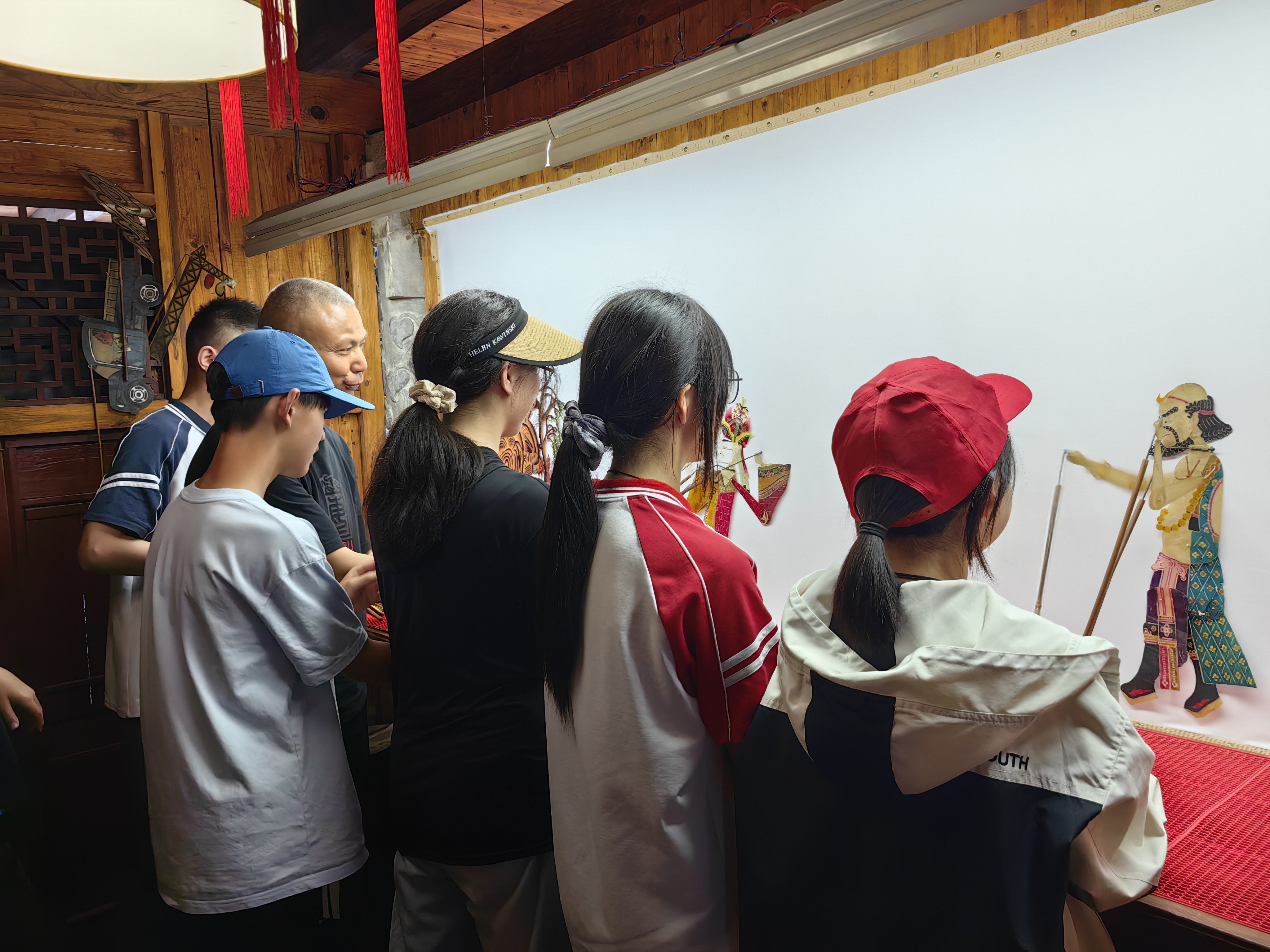 在皖南皮影博物馆前,同学们聆听国家级非遗传承人何泽华讲解皮影戏400余年的发展历程及其作为省级非遗的文化价值。接着,何老师带来了一场别开生面的皮影戏表演,感受光影交织的奇妙艺术。随后,同学们化身“非遗小匠人”,亲手制作专属皮影角色,并尝试即兴表演。同学们感叹:皮影戏不仅需要精湛的绘画、涂色等技艺,还要团队配合才能让角色‘活’起来!”何老师还就皮影戏面临的传承困境与学生展开探讨,启发大家思考非遗保护的新路径。