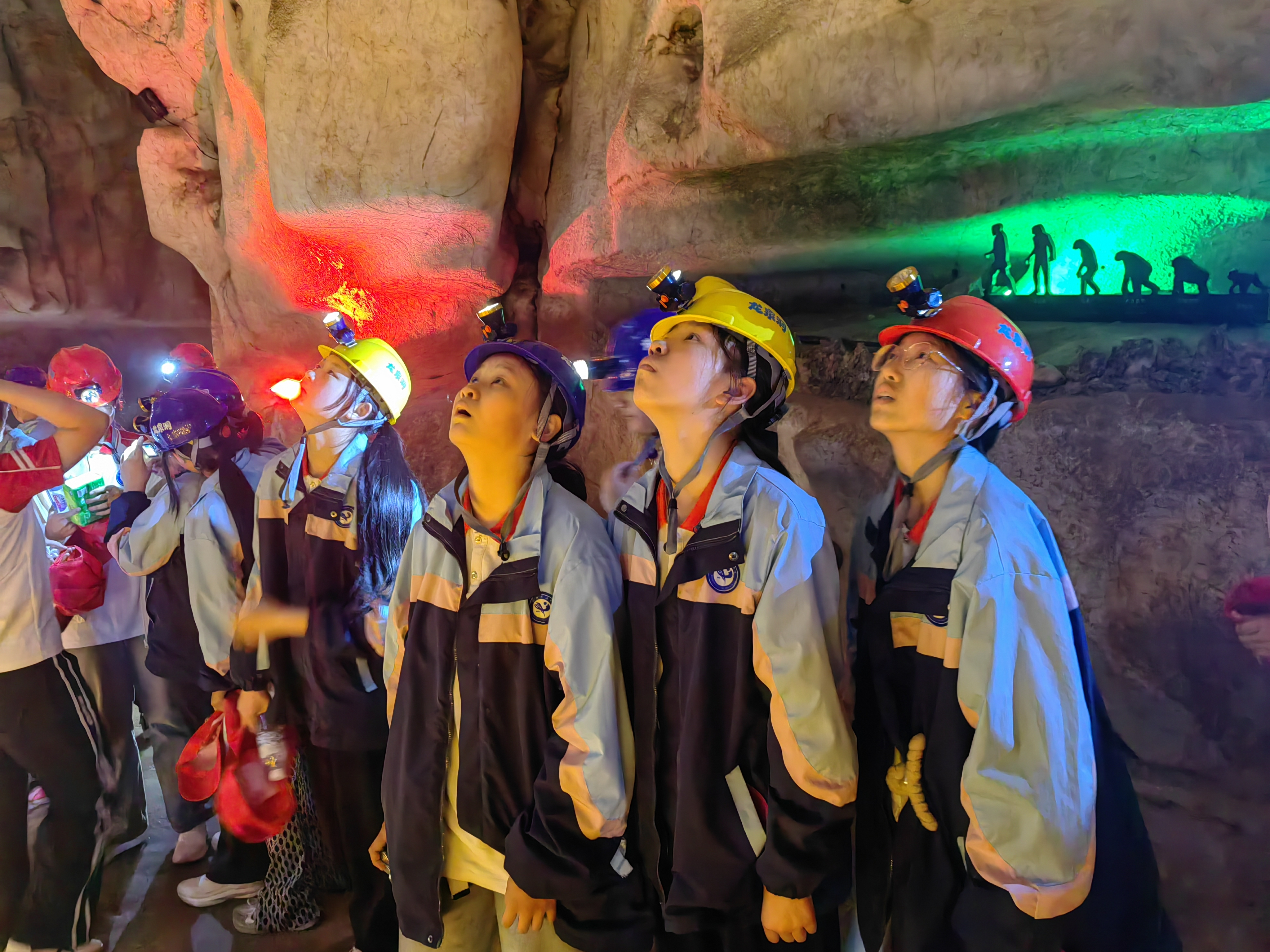 活动的最后一站是喀斯特地貌奇观——龙泉洞。在导师的带领下,同学们手持探灯,观察钟乳石、石笋等地质遗迹,学习碳酸钙沉积的科学原理,感受大自然“滴水成石”的鬼斧神工。洞内清凉幽深,石壁折射出斑斓光影,仿佛与上午皮影戏的光影艺术遥相呼应。