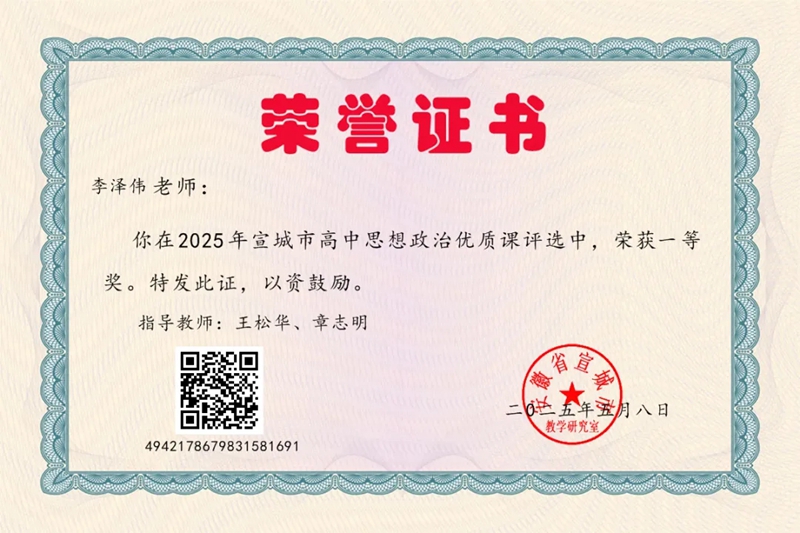 近日,宣城市高中政治优质课评选结果揭晓,我校李泽伟老师获得一等奖(指导教师:王松华、章志明)。特此喜报,向获奖的教师和指导教师表示祝贺!