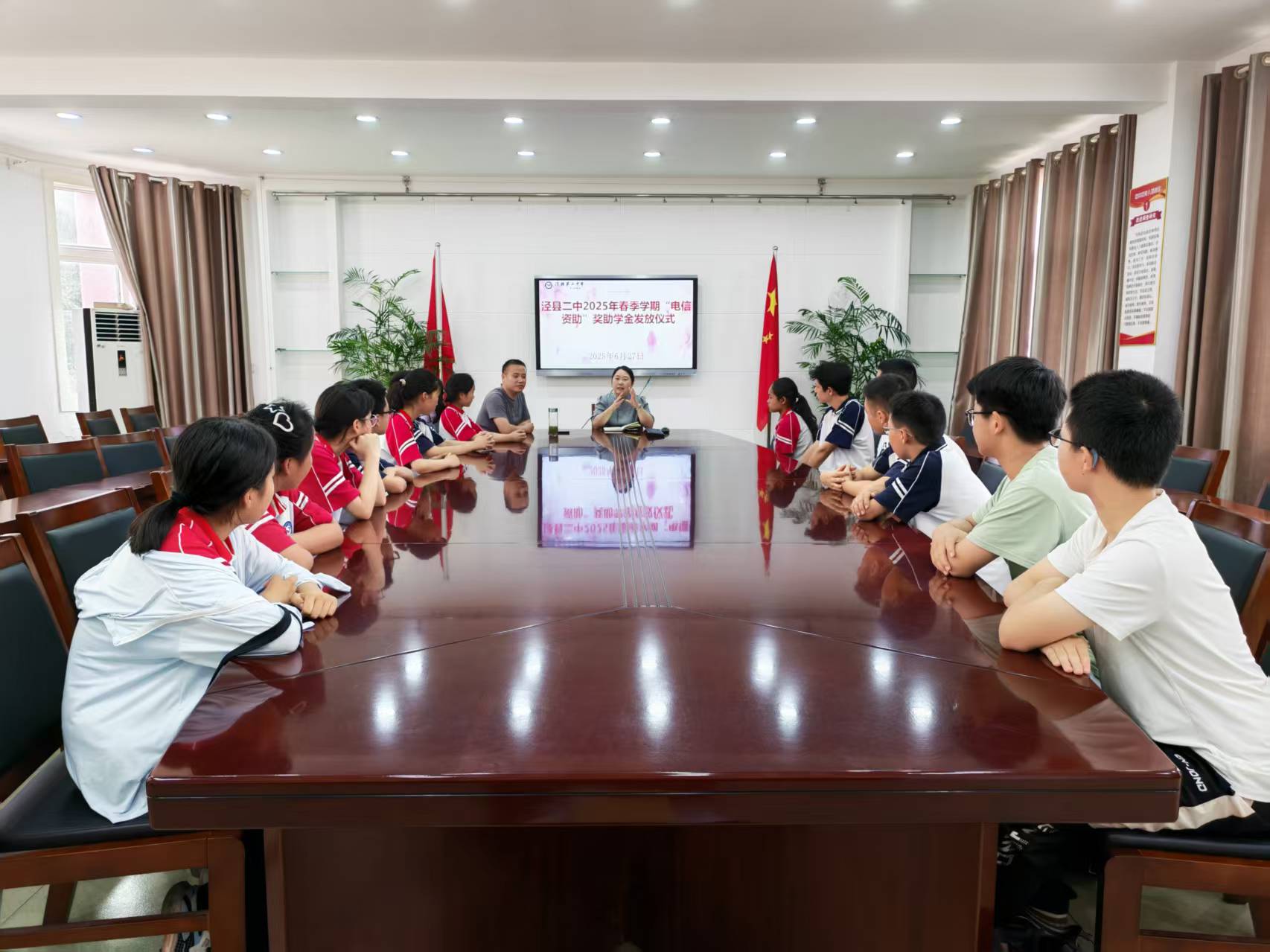 6月27日上午,泾县二中在第一会议室举行2025年春季学期“电信资助奖助学金”发放仪式。受资助学生、校学生资助中心工作人员、副校长章璋参加仪式。