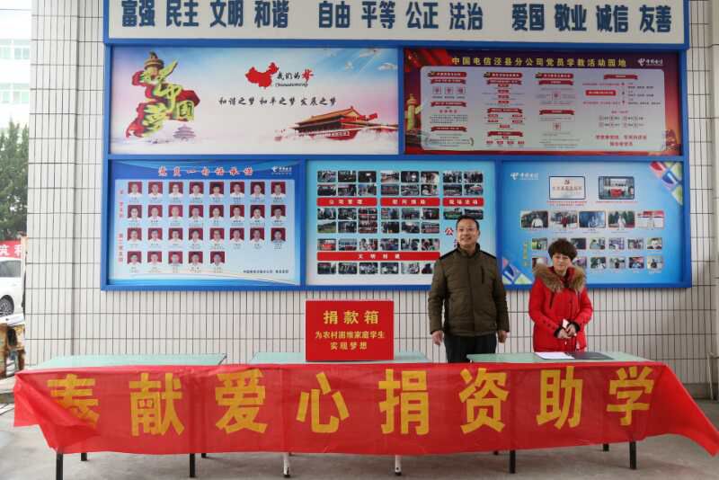 中国电信有限公司泾县分公司2016年4月通过职工捐款的形式设立了贫困助学基金,由分公司党员、干部带头,全体员工共同参与,自发筹集了爱心款,资助泾县二中4名特困学生用于资助他们的学习和生活费用,捐助活动每季度开展一次。此项活动的开展,给予我们贫困孩子物质上的支持以及精神上的鼓励,能够给优秀的孩子们前进的动力,使我们从内心深处感受到了社会的温暖和该公司强烈的社会责任感。我们的学生决不辜负大家的殷切期盼,一定更加努力,以优异的成绩来回报社会。