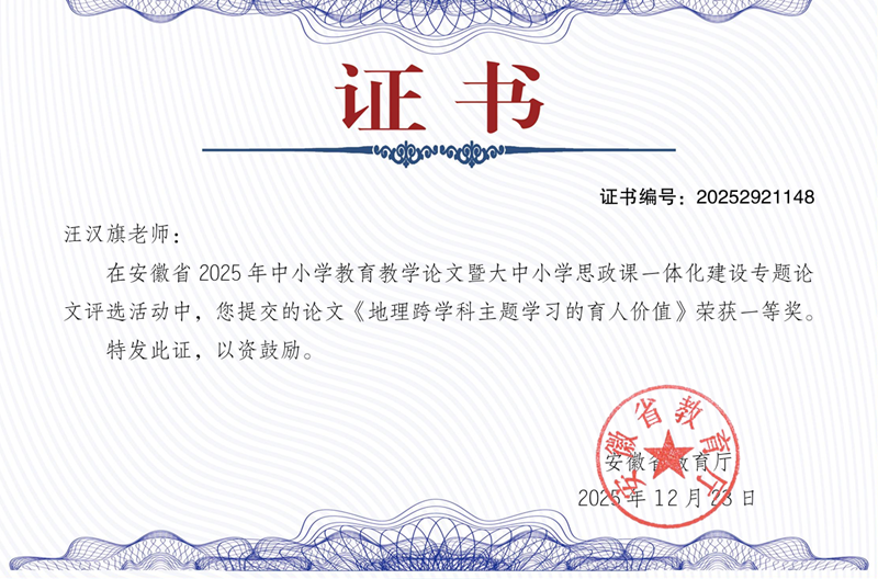 近日,安徽省2025年中小学教育教学论文暨大中小学思政课一体化建设专题论文评选结果正式揭晓,我校谭家敏、汪汉旗两位教师的论文《中学音乐:打破学科壁垒,探索美育实践“新乐章”》《地理跨学科主题学习的育人价值》从众多参赛作品中脱颖而出,双双斩获一等奖,为学校赢得了荣誉,也为我校教育教学研究工作再添亮眼一笔!