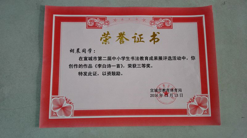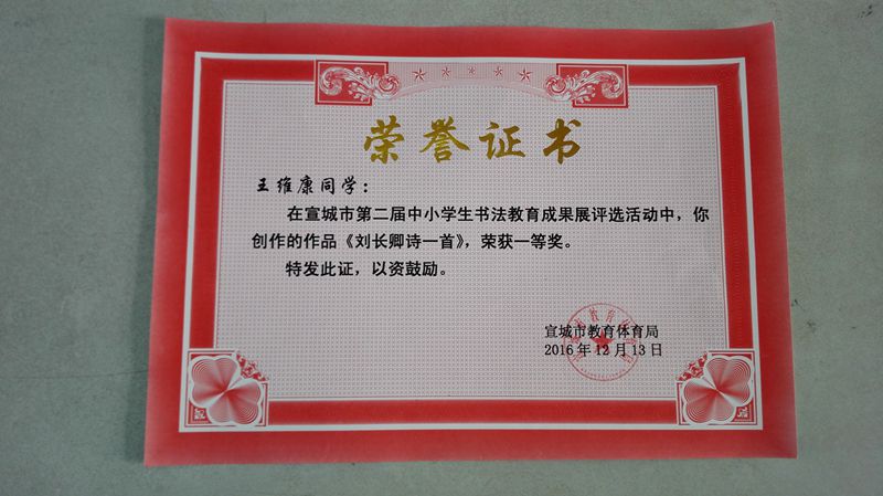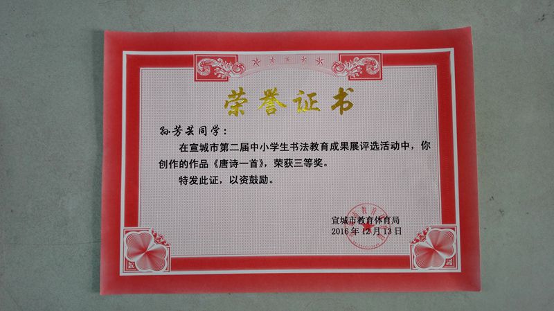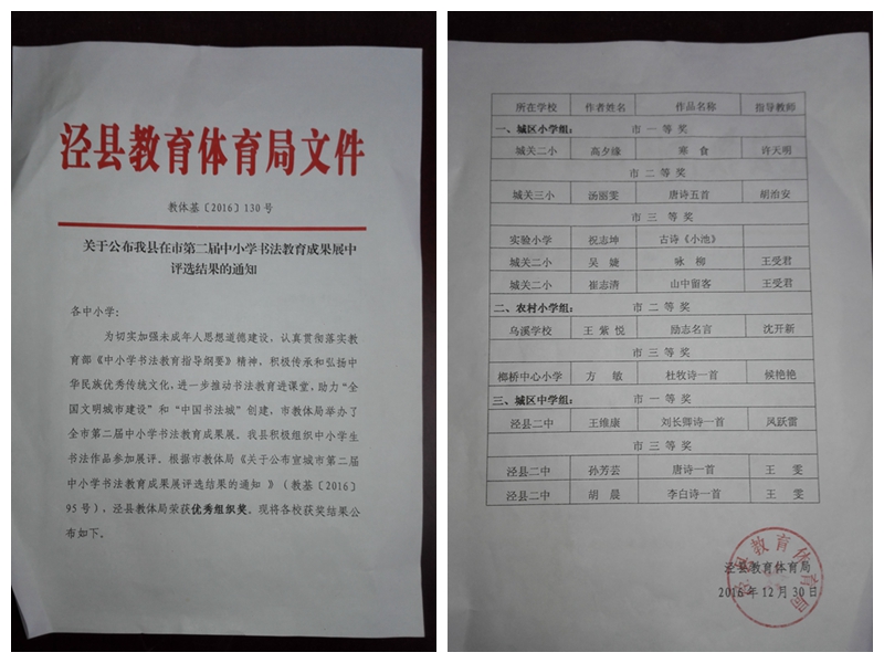 由宣城市教体局举办的全市第二届中小学书法教育成果展评选结果已揭晓,我校再获佳绩,王维康同学作品获城区中学组一等奖,孙芳芸、胡晨同学作品获城区中学组三等奖。获奖层次高,是全县中学组唯一获奖学校。
