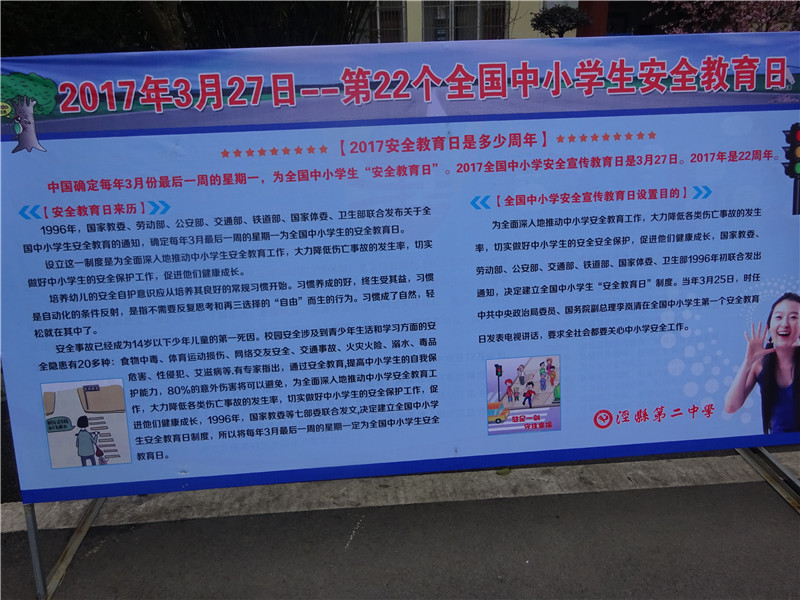 3月27日是第22个全国中小学生安全教育日。为进一步提高学校学生安全意识和自我防护能力,预防和减少学生安全事故的发生,我校积极组织开展“第22个全国中小学生安全教育日”主题日系列教育活动,通过国旗下讲话、主题班会和电子屏宣传标语、展板、家长校讯通平台等把预防学生安全事故工作落到实处。