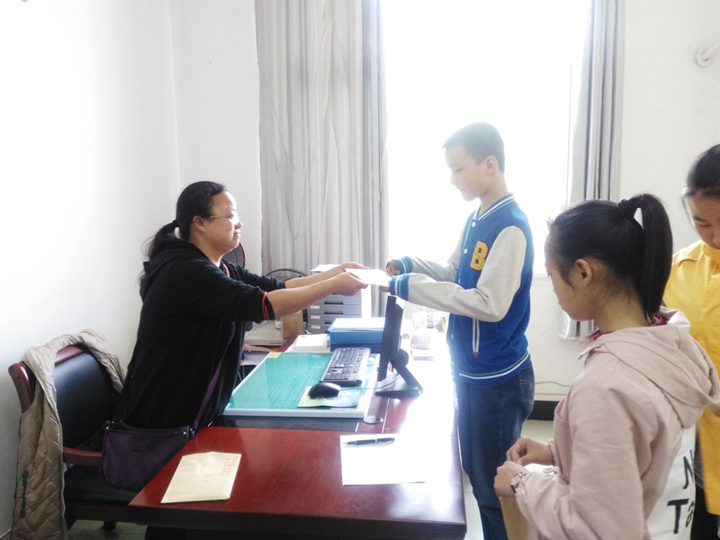 2017年4月28日上午课间操时间,接受电信公司资助的四位学生来到泾县二中资助办办公室,从资助办老师手中接过中国电信股份有限公司泾县分公司的党员干部自发筹集的2017年第一季度爱心资助金,从有整有零的现金里感受到电信公司的暖意。