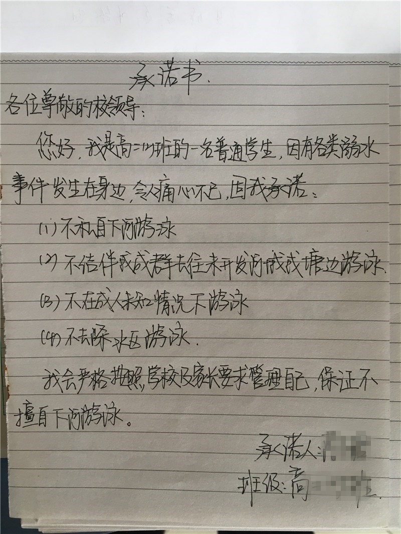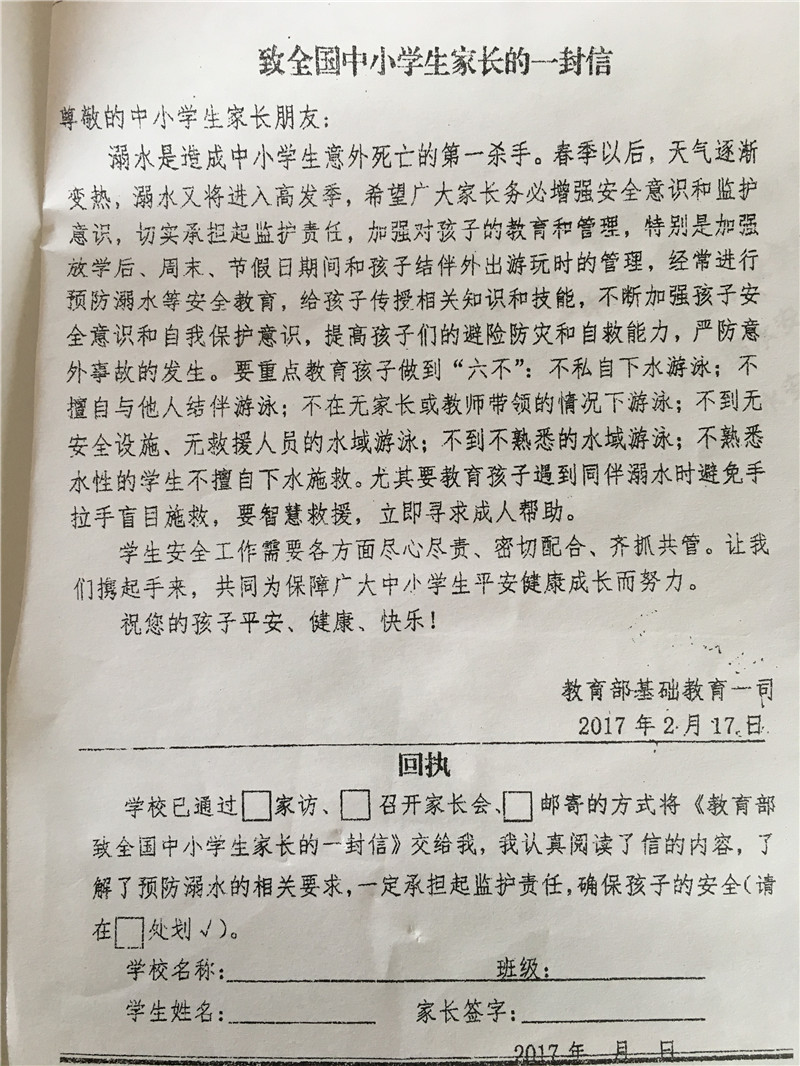 十三、通过签订预防学生溺水安全承诺书、回执等形式增强家长、学生的安全及责任意识。