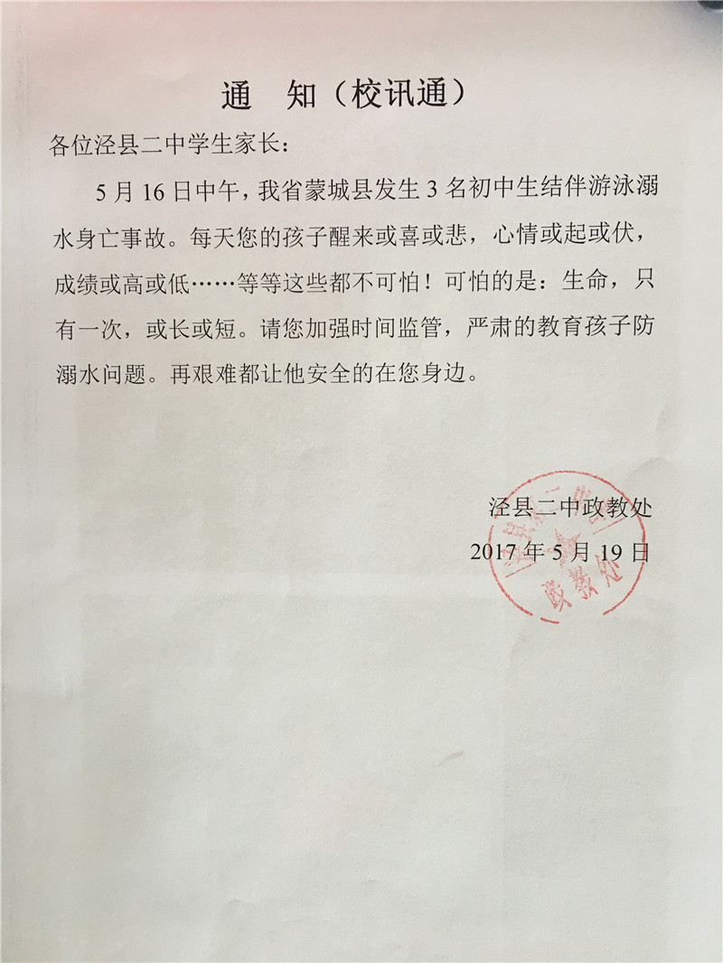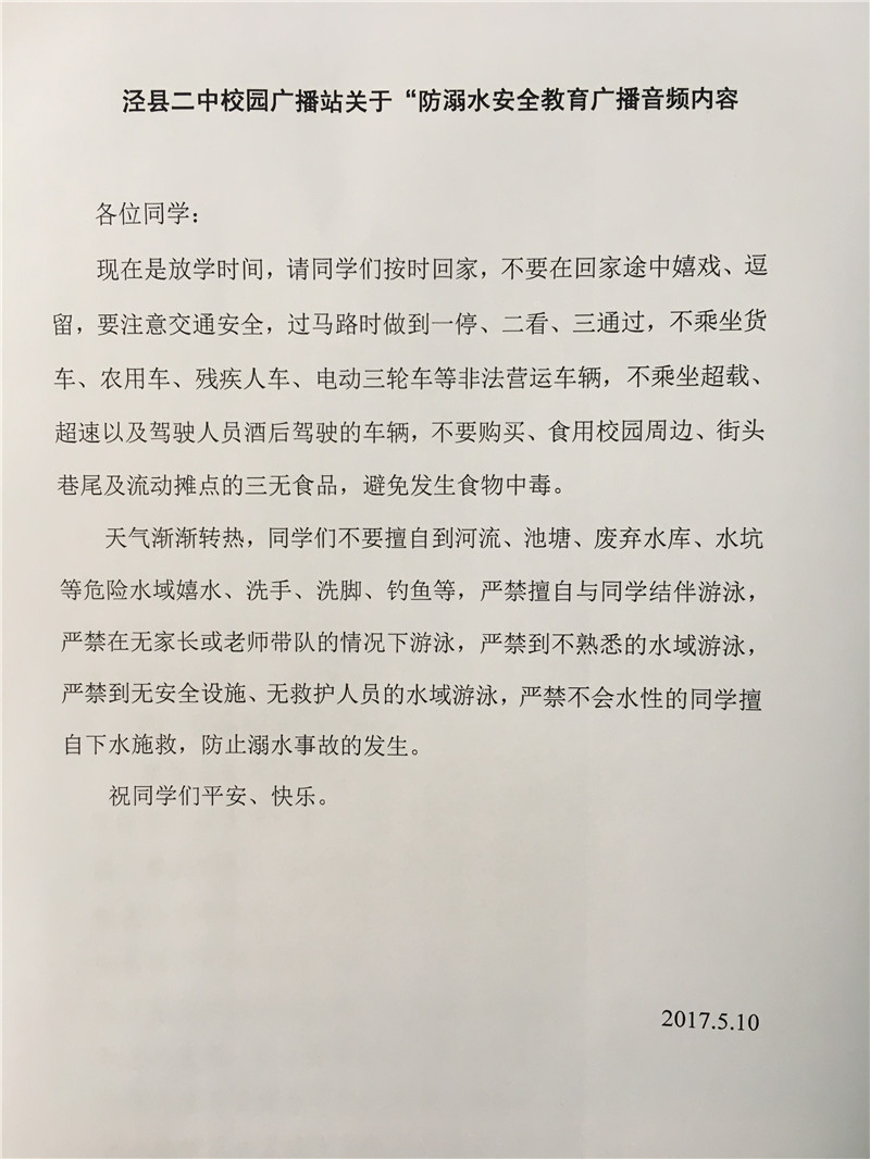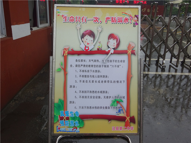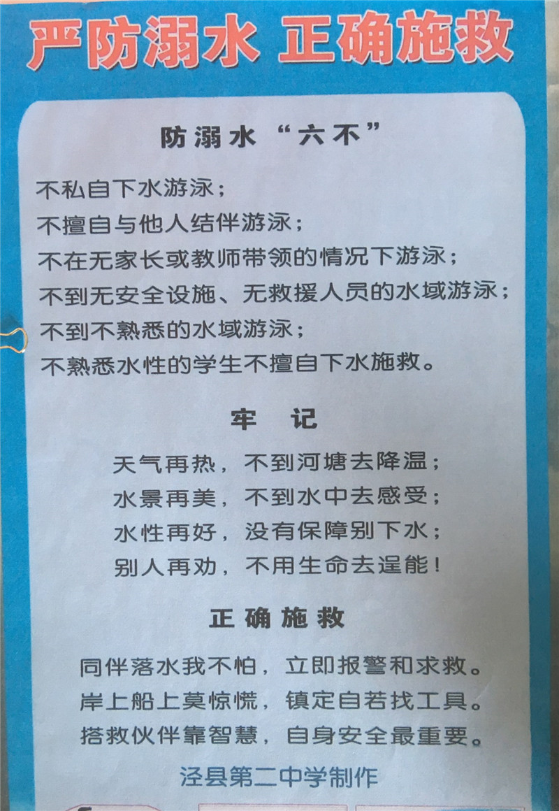 期末临近,暑假即将来临。学校在不断总结前期防溺水教育活动的同时,将继续加大防溺水工作以确保泾县二中全体师生安全。