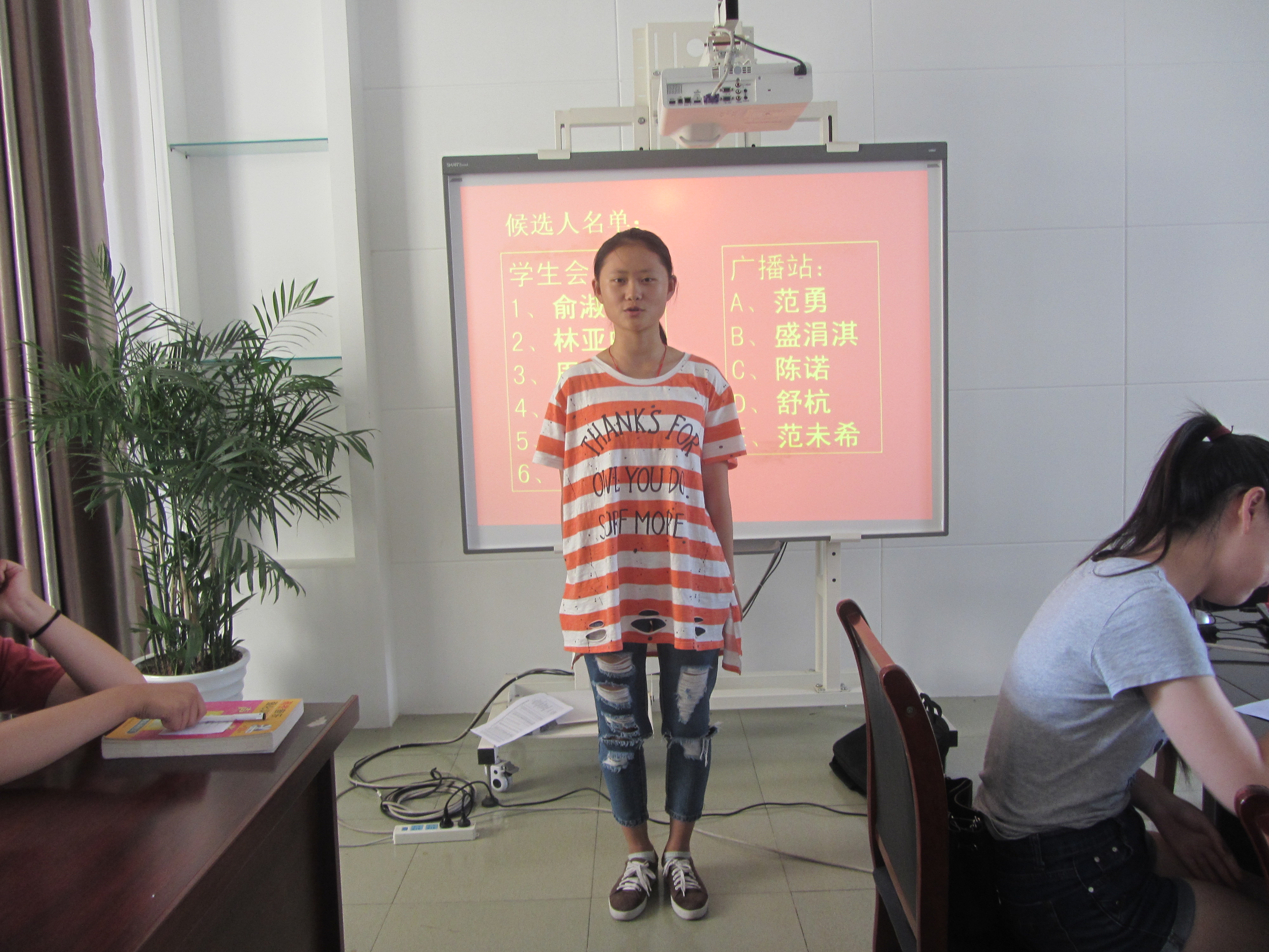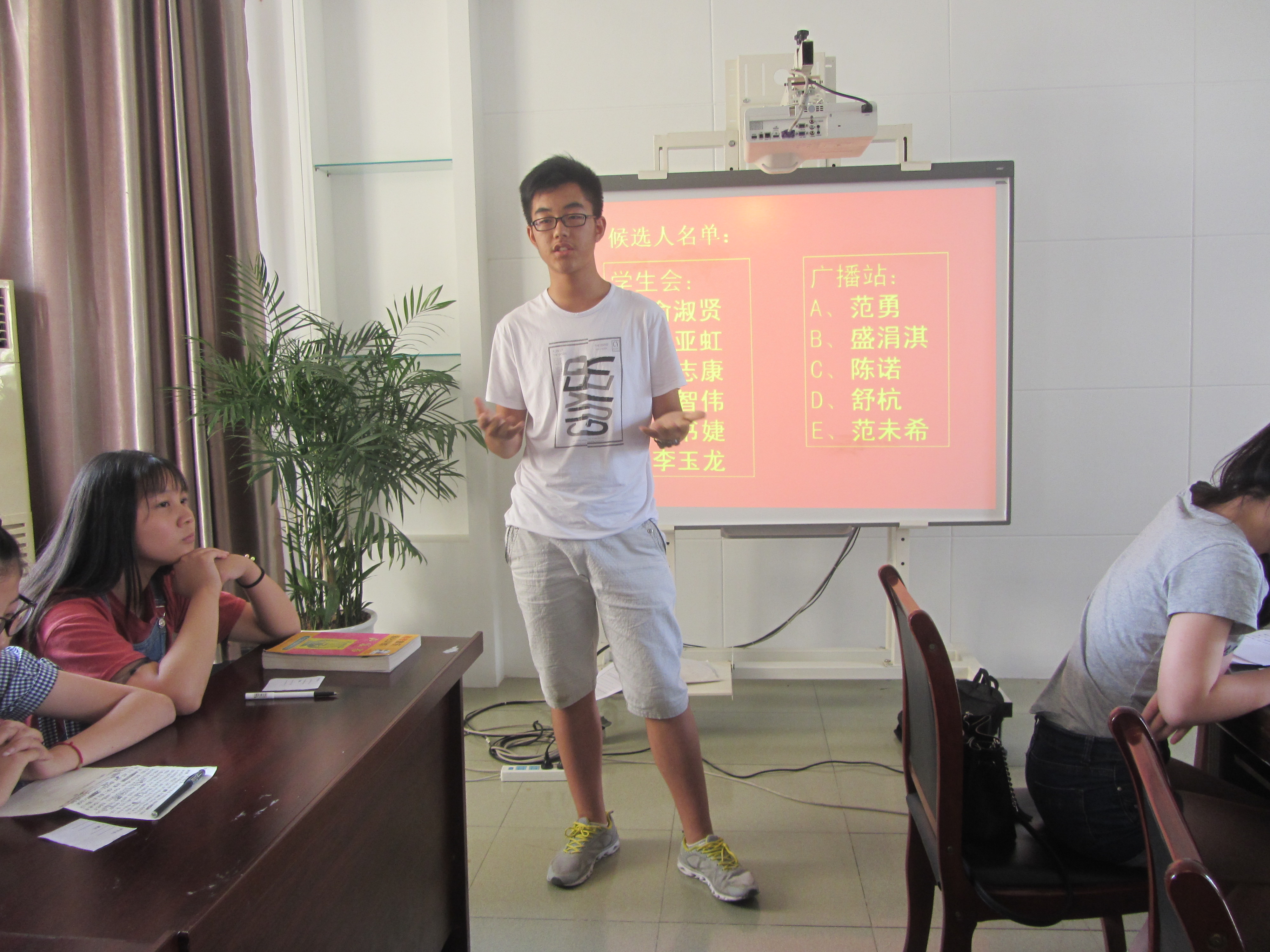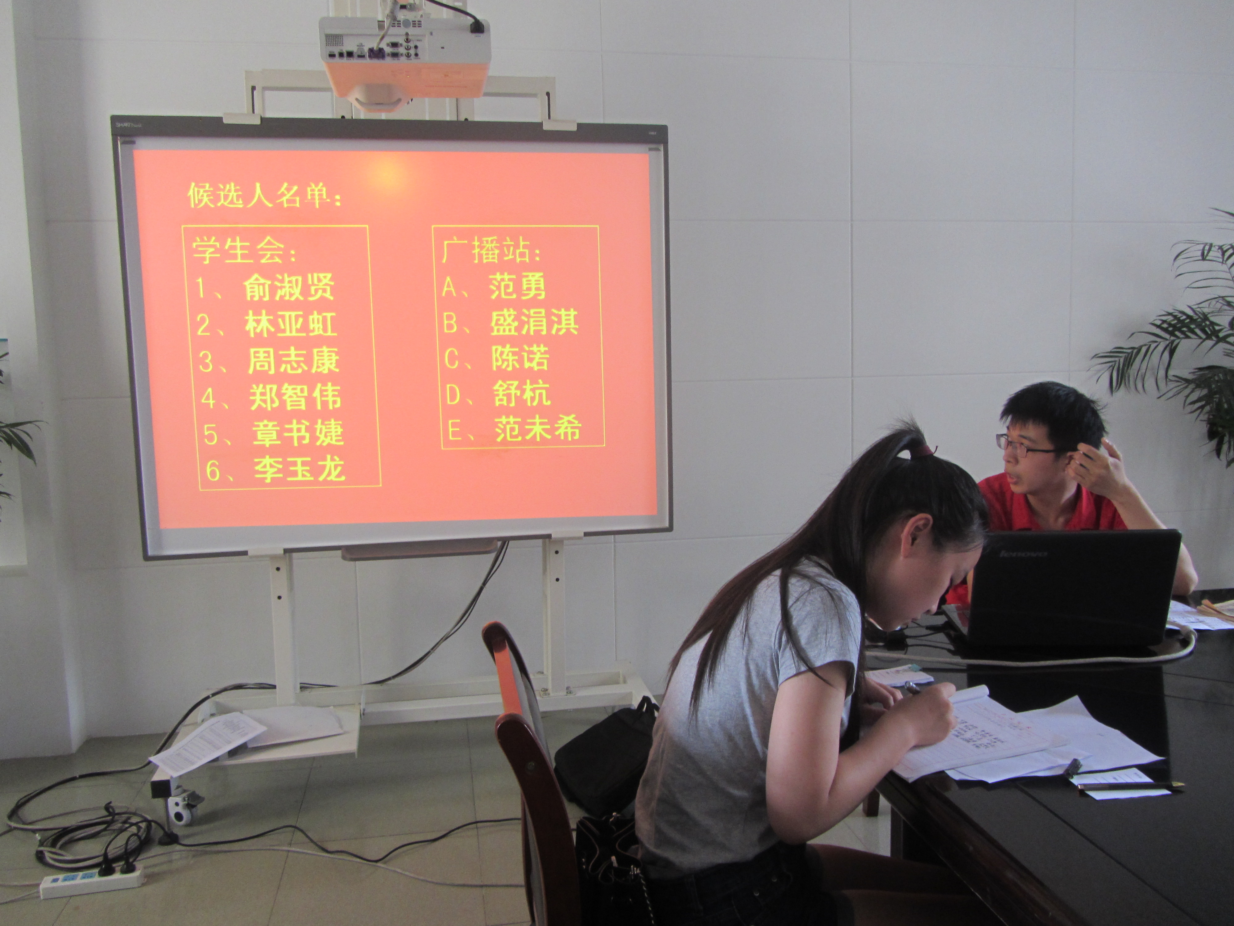 校团委徐盛昊老师肯定了上届学生会的成绩,再次阐述了学生会的性质、地位与作用,并结合学生会一年来的工作希望全体学生会成员能够做到:有奉献精神、有责任意识、有坚持的信念,并就此次换届选举学生会主席团候选人的酝酿产生作了具体说明。来自全校高一、高二年级共34名学生会成员参加了投票选举。换届竞聘会本着公平公正的原则在一片热烈、祥和的气氛中圆满结束。