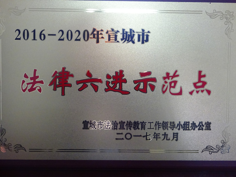 近日,我校被宣城市法治宣传教育工作领导小组办公室授予宣城市第二批“法律六进”示范点荣誉称号。“法律六进”指的是法律进机关、法律进乡村、法律进社区、法律进学校、法律进企业、法律进单位,“法律六进”示范点的评选是经全市各地申报、推荐,市法宣办实地考核、验收后方可命名。据悉,在本次法律进学校的评选中,全市仅有三所中学当选。