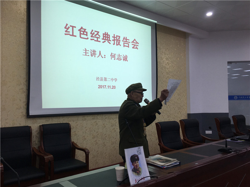 本次报告会邀请了全国关心下一代优秀工作者、全国离退休干部先进个人、安徽省全民国防教育先进个人、安徽省第二届道德模范、芜湖市关工委宣讲团成员何志诚来宣讲革命烈士事迹。何老是一名参加过抗美援朝的88岁高龄的退伍军人,他一直心怀社会主义的坚定信仰和对革命先烈的无比崇敬。讲座开始前,何老整了整军装,佩戴好军功奖章,向全体听报告会的全体人员郑重的敬了军礼。讲座的一开始他从当今严打贪污腐败到列举一些革命英烈的事迹。他还邀请了两名同学朗诵诗篇《红军赞》和《黑牢诗篇》。然后告诫同学们要铭记历史,任何时候任何情况下都不要忘记了革命先烈们,要珍惜当前,努力学习并展望未来。最后以歌唱红歌结束整场报告会。