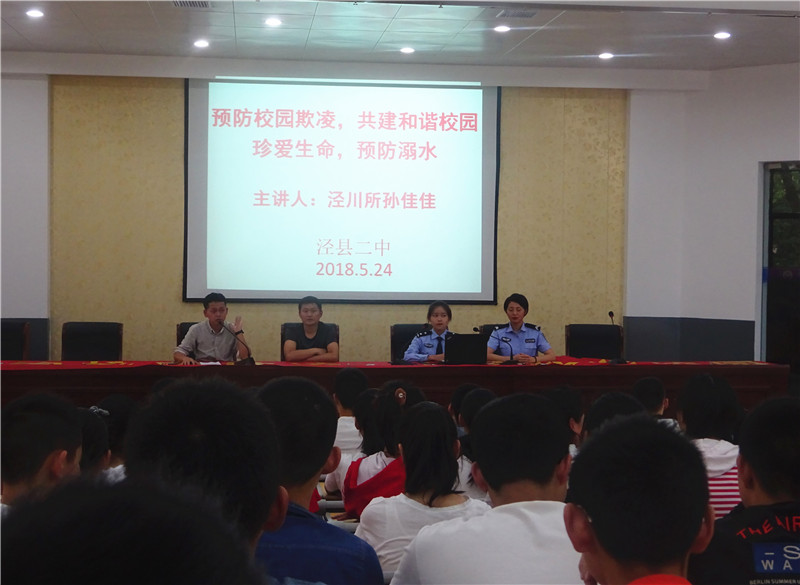 5月24日下午4:00,我校200多名学生在阶梯教室听取了由泾川派出所孙佳佳警官所作的主题为“珍爱生命,预防溺水”及“反对校园欺凌,共建和谐校园”的专题讲座。报告会由政教处主任徐维主持,相关班主任和学校政教处人员参加了此次报告会。