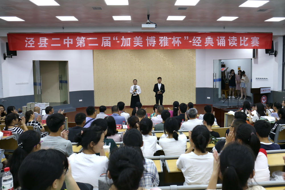 诵读经典作品,润泽书香人生。为了丰富校园文化生活,提高学生人文素养,建设书香校园,创建普通话省级示范校,同时,也为了展示我校高中学子才艺,培养明日之星,6月25日晚,我校在阶梯教室举行第二届“加美博雅杯”经典诵读比赛,全校高中部非毕业班选送的22个诵读节目精彩呈现,高一年级200多名学生在观看和聆听经典诵读中获得了丰富的文化滋养。