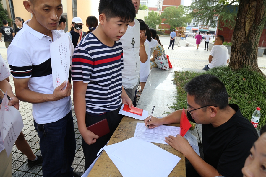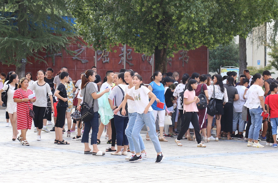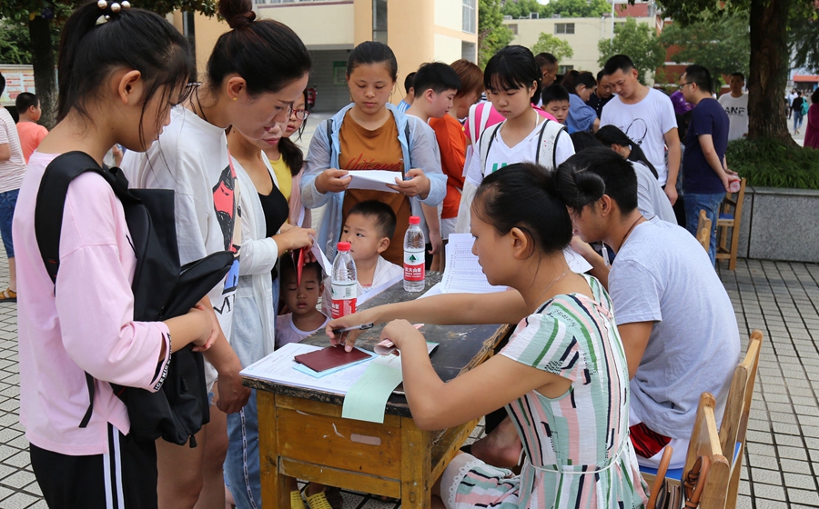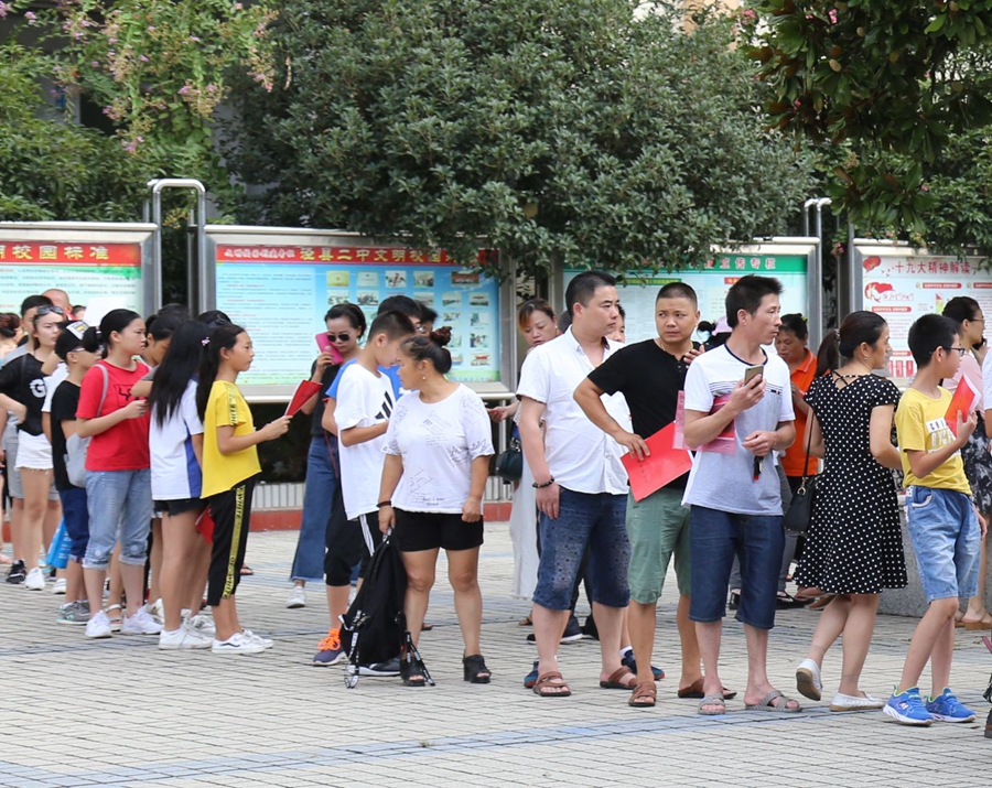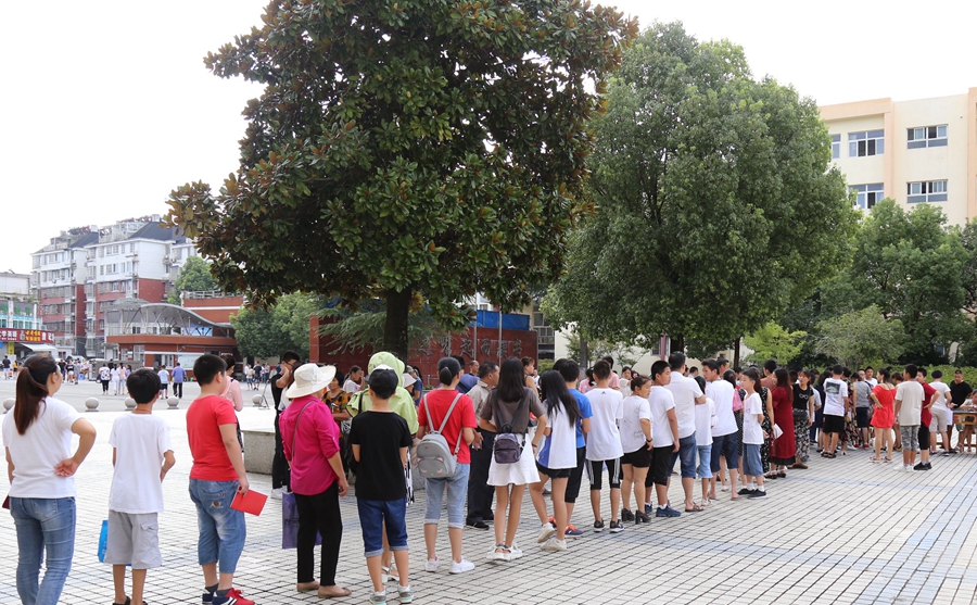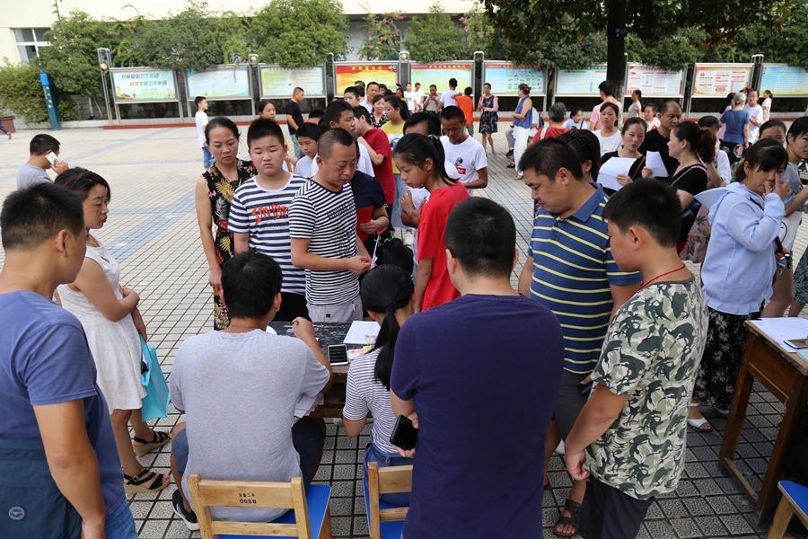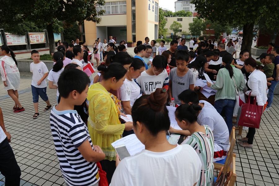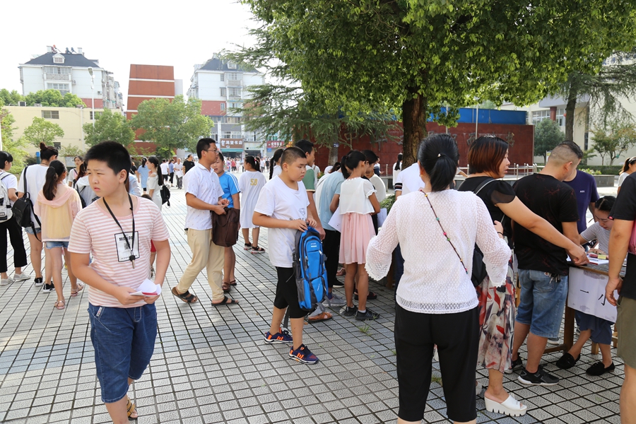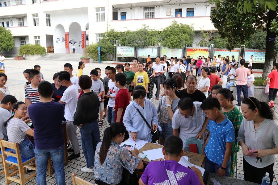 根据县教体局城区划片招生规定,今年我校七年级新生总数近600人(不含两个班留守儿童100人)。为了保证新生入学报到工作有序开展,学校高度重视,预先制定了迎新工作方案。是日,学校领导早早来到报到现场,深入了解迎新进展情况,亲切看望新生和家长,并现场指挥调度;教导部门承办报名工作,分组分工分环节进行;政教部门安排人员协助家长车辆停放和维护现场秩序;总务部门积极做好学生到校的有关教学与生活等后勤保障;参与报名工作的老师们不厌其烦地解答家长们的各类问题,并热情地为家长、学生提供各种帮助。由于精心组织,前期工作细致到位,各方协同努力,整个报到入学工作忙而不乱,新生咨询、填表、检录、报名等环节井然有序、有条不紊地进行。